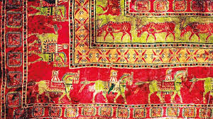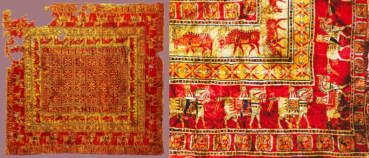 The technique used in weaving the 2500-year-old Pazyryk Carpet, which has 36 symmetrical loops on each centimeter, indicates that weaving evolution has a long history. There are motifs of deers and men riding horses around the carpet, which has a red central background.