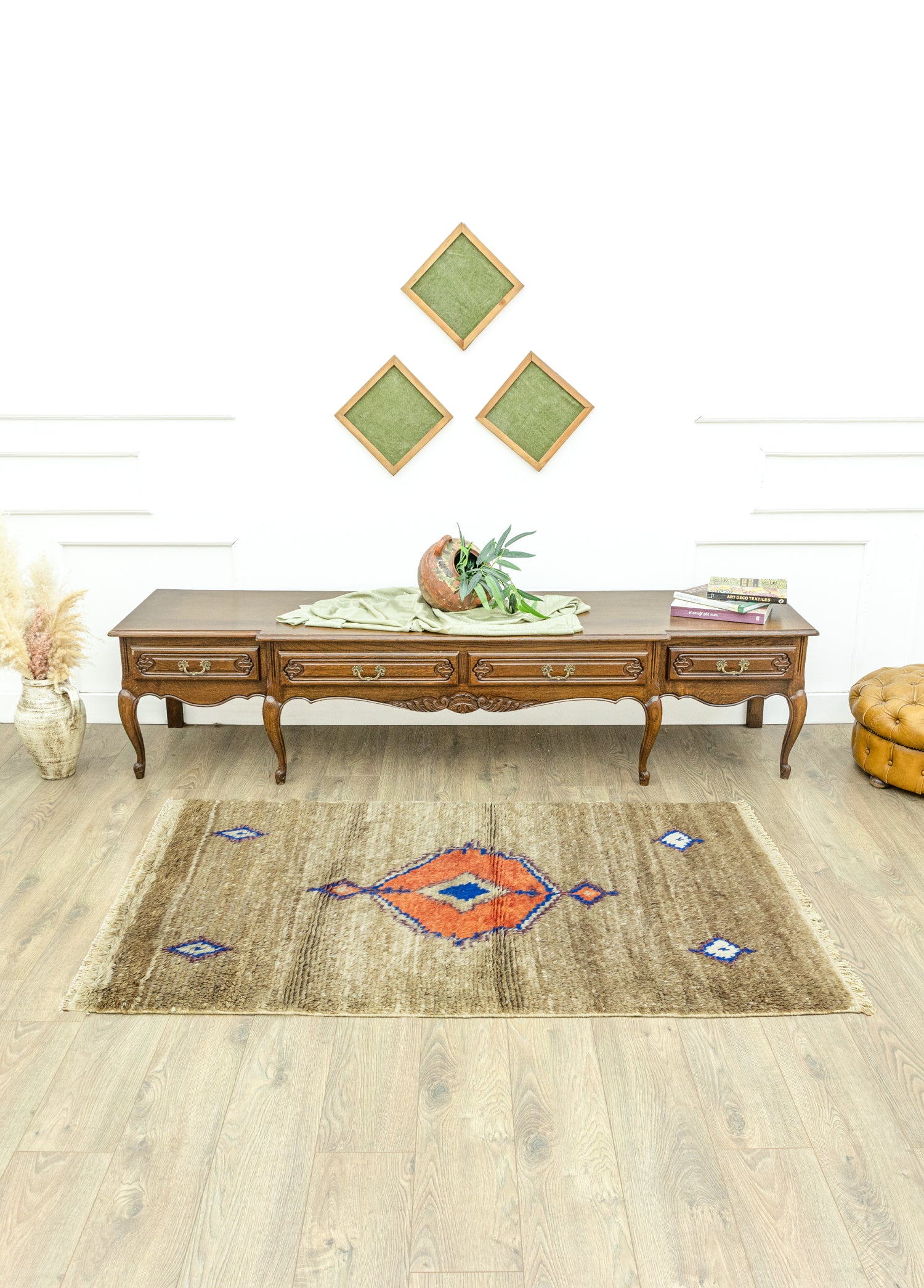 Soho Antiq el dokuma halı ve kilimleri, yaşam alanlarınızanefes katmak için tasarlanmıştır. Bu zarif el dokuma halı, özenle seçilmişyüksek kaliteli yün ve tiftik ipliklerinin ustalıkla bir araya getirilmesiyleoluşturulmuştur. Geleneksel el dokuma teknikleri kullanılarak üretilen halı,evinize sıcaklık ve zarafet katmak amacıyla özel olarak tasarlanmıştır. Renkpaleti, doğanın yumuşak tonlarından ilham alınarak oluşturulmuş olup, açık kahverengi ve turuncu renklerinin uyumuyla dikkat çekerken halı içerisinde bulunan diğer renkler ileuyumu yakalamaktadır. Halı, deneyimli el sanatçıları tarafından özenle dokunmuşve Konya, Karapınar yöresine özgü geleneksel tekniklerle 1970’lerde üretilmiştir, bu da halıyakültürel bir derinlik katmaktadır. Halının ebatı 102 x 172 cm olarak ölçülmüştürve bu ölçü, halının farklı yaşam alanlarına kolaylıkla uyum sağlamasını sağlar.Halının kalınlığı ise 1 - 3 cm arasındadır. Estetik değerinin ötesinde, bu eldokuma halı, evinize özgünlük ve geleneksel bir his katma konusunda öneçıkmaktadır.