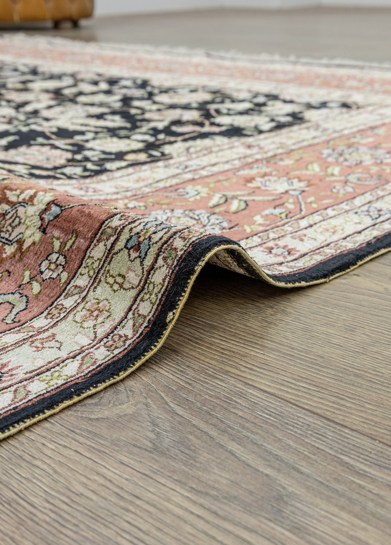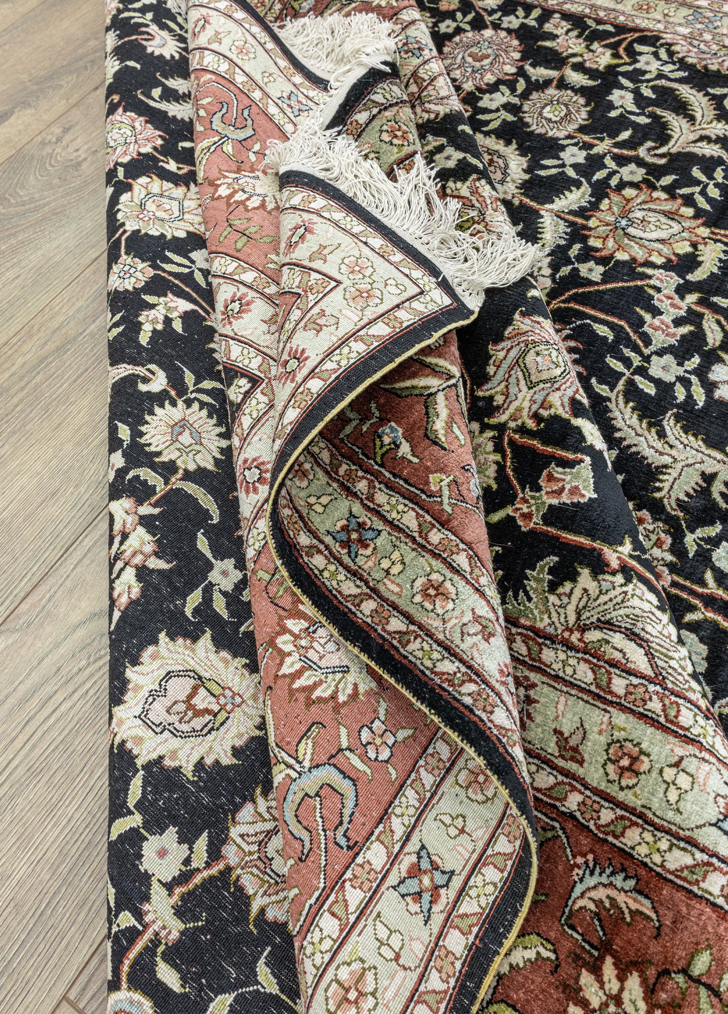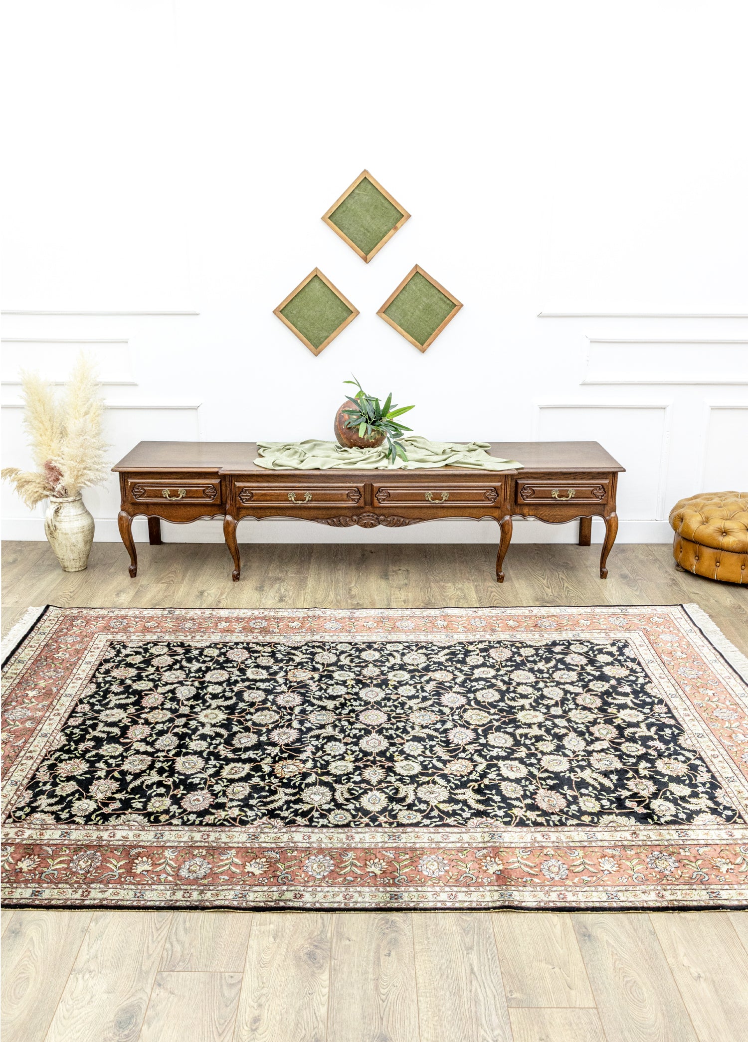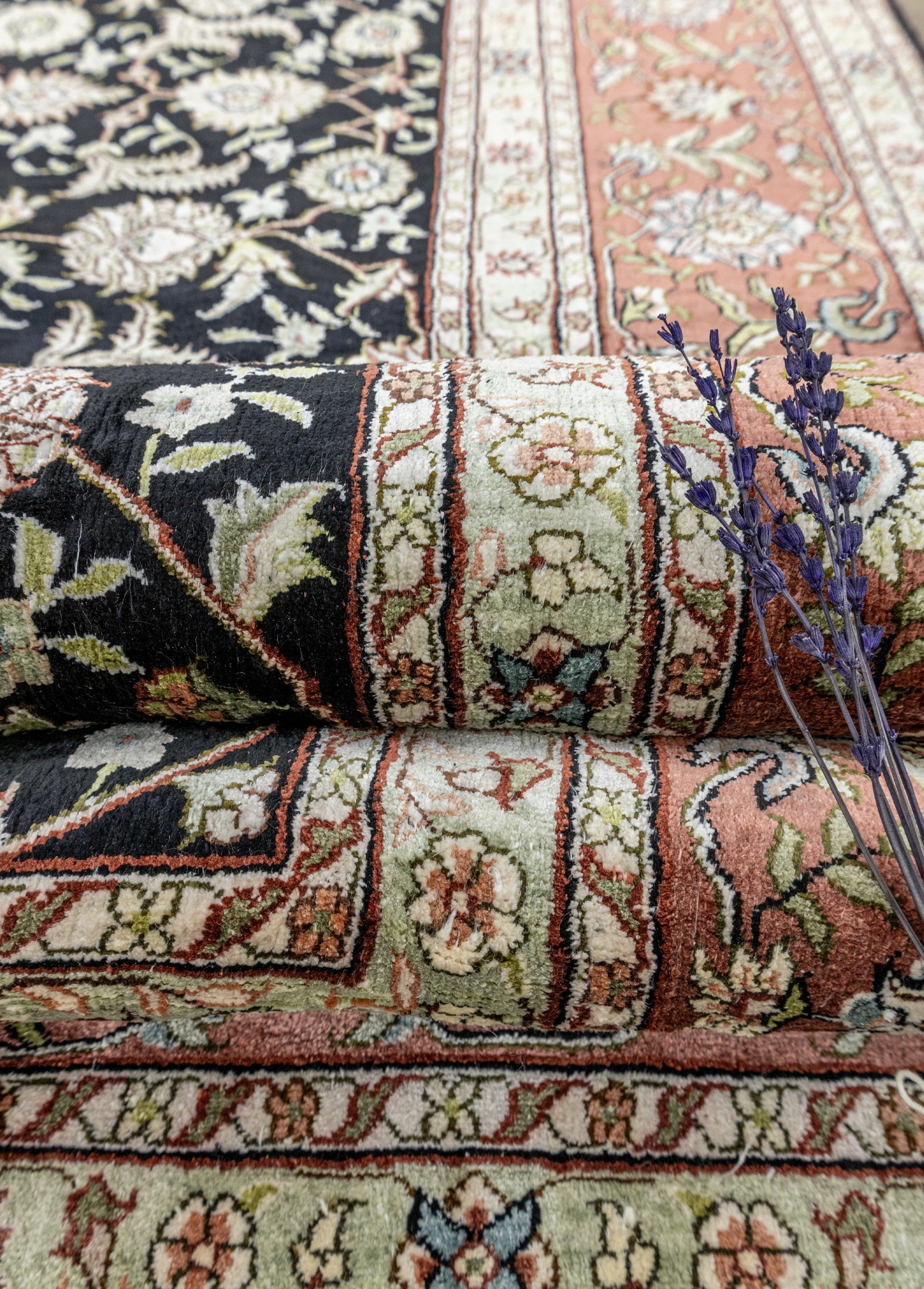 Geleneksel el dokuma teknikleri kullanılarak üretilen halı,evinize sıcaklık ve zarafet katmak amacıyla özel olarak tasarlanmıştır. Renkpaleti, doğanın yumuşak tonlarından ilham alınarak oluşturulmuş olup, siyah ile krem renklerinin uyumuyla dikkat çekerken halı içerisinde bulunan diğer renkler ilede dengeli bir bütünlük sunar.