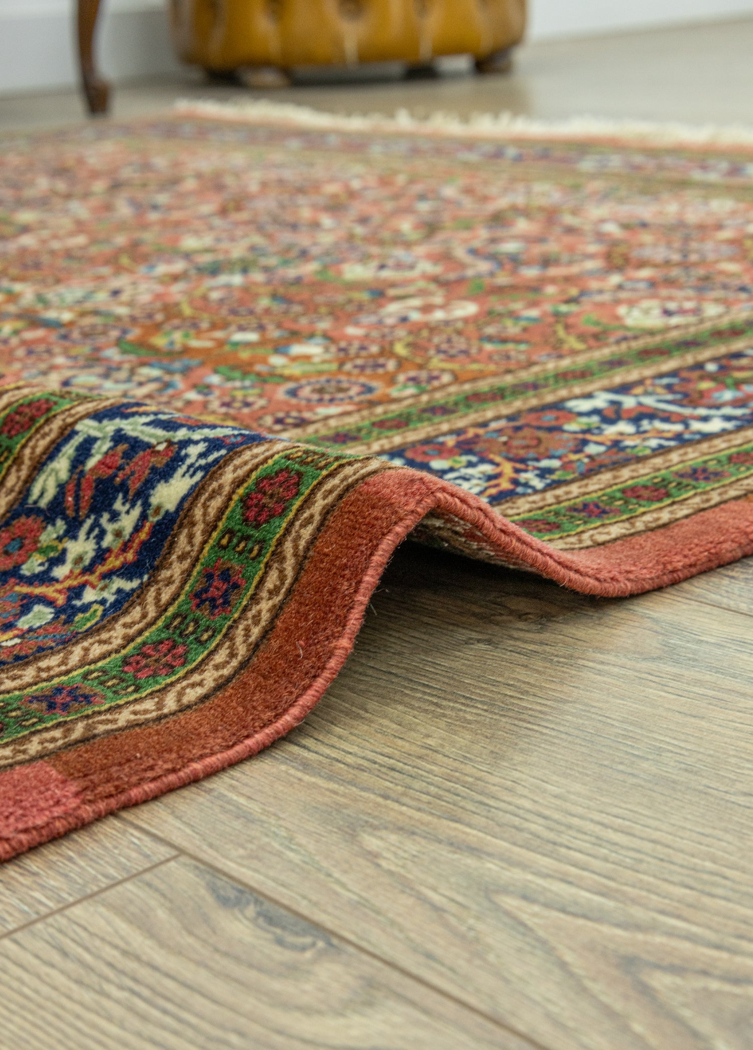 Soho Antiq el dokuma halı ve kilimleri, yaşam alanlarınıza nefes katmak için tasarlanmıştır. Bu zarif el dokuma halı, özenle seçilmiş yüksek kaliteli yün ipliklerinin ustalıkla bir araya getirilmesiyle oluşturulmuştur. Geleneksel el dokuma teknikleri kullanılarak üretilen halı, evinize sıcaklık ve zarafet katmak amacıyla özel olarak tasarlanmıştır. Renk paleti, doğanın yumuşak tonlarından ilham alınarak oluşturulmuş olup, kiremit ile mavi renklerinin uyumuyla dikkat çekerken halı içerisinde bulunan diğer renkler ile uyumu yakalamaktadır. Halı, deneyimli el sanatçıları tarafından özenle dokunmuş ve Sivas yöresine özgü geleneksel tekniklerle 1940'larda üretilmiştir, bu da halıya kültürel bir derinlik katmaktadır. Halının ebatı 150 x 215 cm olarak ölçülmüştür ve bu ölçü, halının farklı yaşam alanlarına kolaylıkla uyum sağlamasını sağlar. Halının kalınlığı ise 1 - 3 cm arasındadır. Estetik değerinin ötesinde, bu el dokuma halı, evinize özgünlük ve geleneksel bir his katma konusunda öne çıkmaktadır.