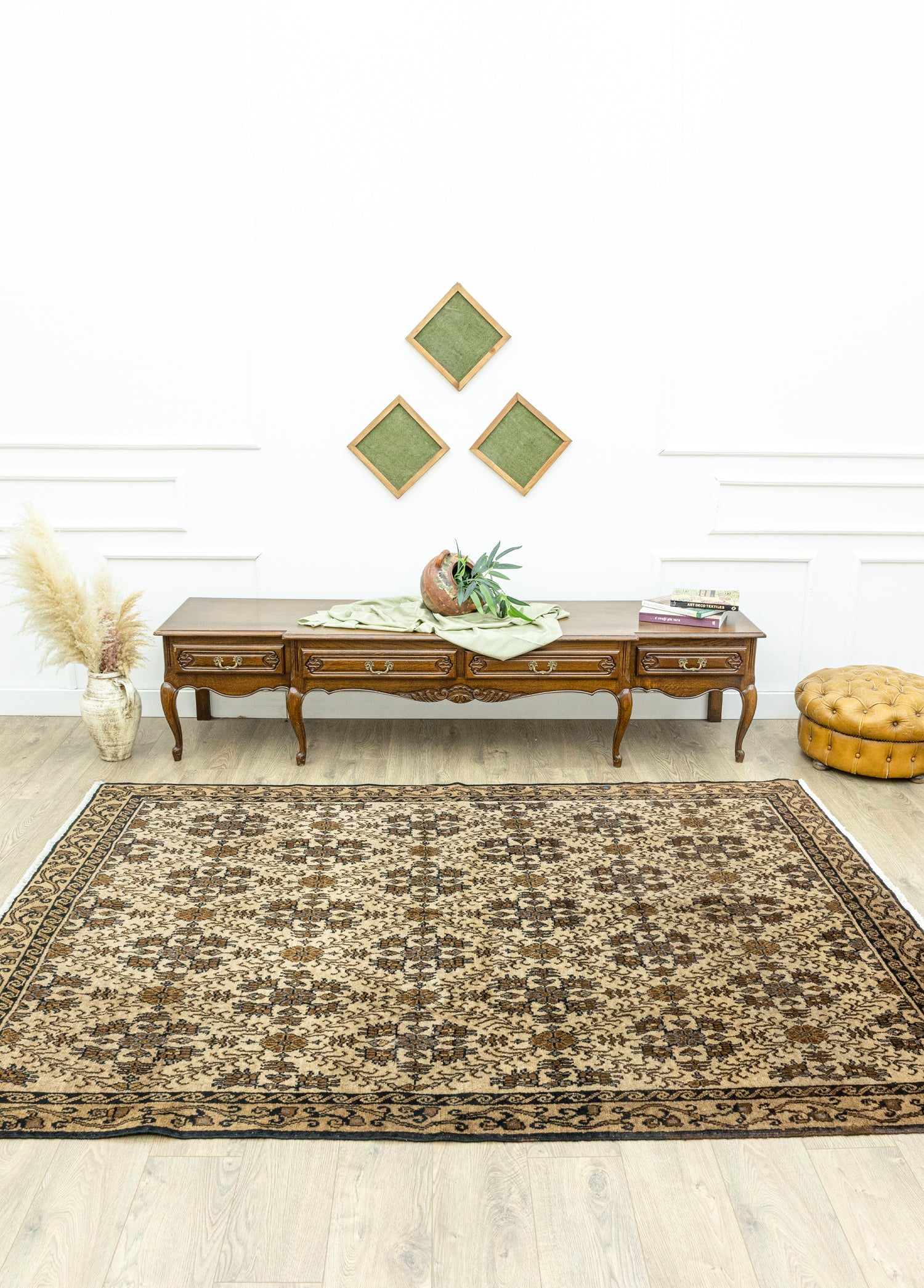 Soho Antiq el dokuma halı ve kilimleri, yaşam alanlarınızanefes katmak için tasarlanmıştır. Bu zarif el dokuma halı, özenle seçilmişyüksek kaliteli yün ipliklerinin ustalıkla bir araya getirilmesiyleoluşturulmuştur. Geleneksel el dokuma teknikleri kullanılarak üretilen halı,evinize sıcaklık ve zarafet katmak amacıyla özel olarak tasarlanmıştır. Renkpaleti, doğanın yumuşak tonlarından ilham alınarak oluşturulmuş olup, kahverengi ve siyah renklerinin uyumuyla dikkat çekerken halı içerisinde bulunan diğer renkler ileuyumu yakalamaktadır. Halı, deneyimli el sanatçıları tarafından özenle dokunmuşve Kayseri yöresine özgü geleneksel tekniklerle 1980’lerde üretilmiştir, bu da halıyakültürel bir derinlik katmaktadır. Halının ebatı 179 x 254 cm olarak ölçülmüştürve bu ölçü, halının farklı yaşam alanlarına kolaylıkla uyum sağlamasını sağlar.Halının kalınlığı ise 1 - 3 cm arasındadır. Estetik değerinin ötesinde, bu eldokuma halı, evinize özgünlük ve geleneksel bir his katma konusunda öneçıkmaktadır.