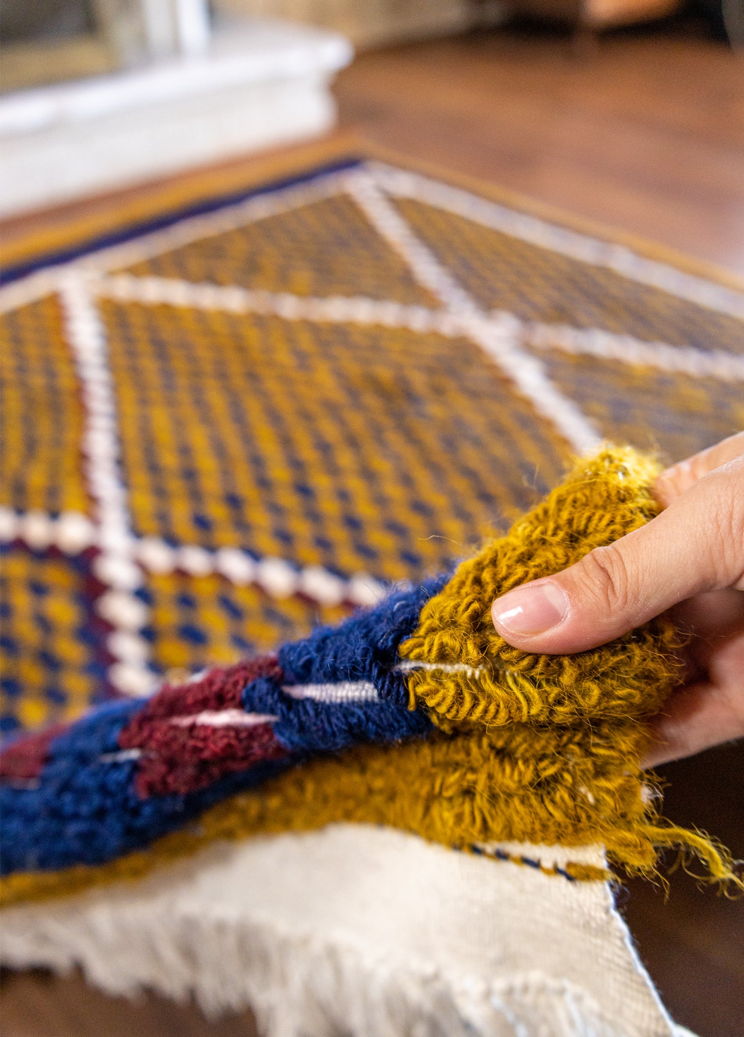 With their elegant and aesthetic designs, our Tülü rug models will add a fresh atmosphere to your living space! This long-lasting rug model is made entirely of wool and designed using the tulü weaving technique. This rug, crafted with the skills that make it unique and ensure its quality over time, has a thickness ranging from 1 to 5 cm and measures 178x185 cm. The main color of the rug you choose from a wide variety of color options is mustard. Other colors available in the rug design include navy blue and white. Soho Antique features rugs with cultural and traditional characteristics. This rug model, which has survived from the past to the present, bears traces of the region where it was woven, and features cultural colors and touches, particularly from Konya. All these traditional touches can be seen in the checkerboard pattern on the rug.