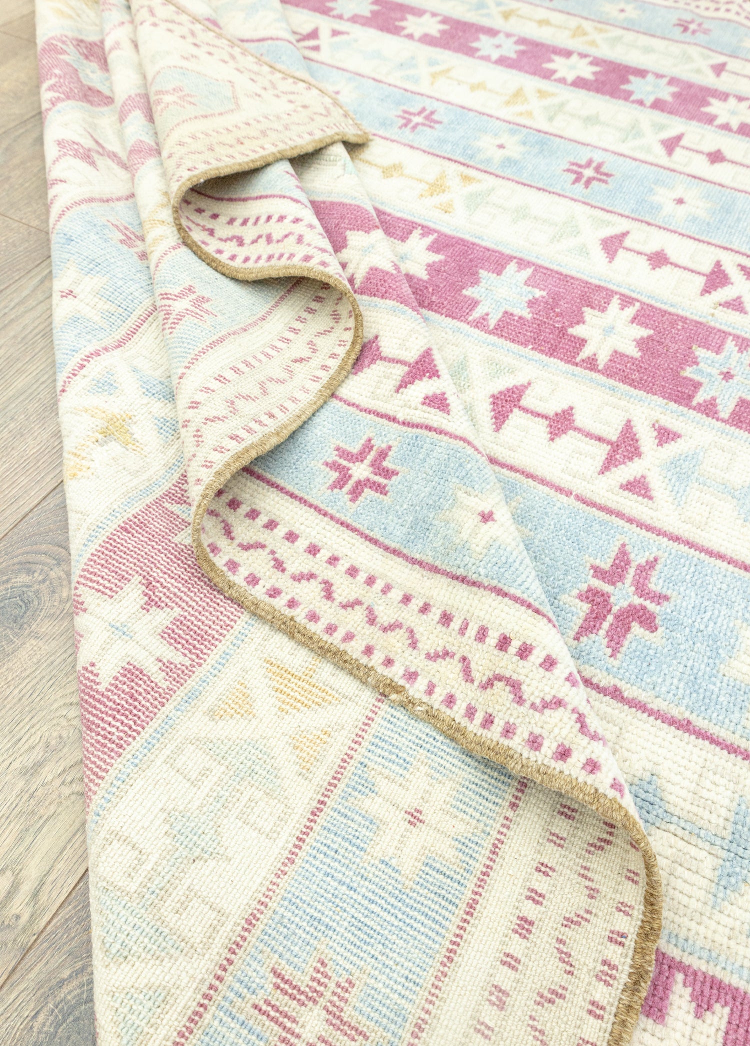 Soho Antiq halımodellerinin içerisinde dilediğiniz konsepte uygun tasarımı bulmak mümkün! SohoAntiq halı modellerimiz tamamen doğal yünden oluşur ve tamamı el dokumasıdır.Halı, 1 ile 3 cm arası bir kalınlığa sahiptir ve boyu 166 x 234 cm’dir. Halıkataloğumuzda bulunan çeşitli renk seçeneklerinden biri olan krem halının anarengidir. Ayrıca halı modelindeki diğer renkler mavi ve pembedir. Soho Antiq, tarihi veyöresel dokunuşlarıyla halı modellerini bir üst seviyeye taşır. Halı üzerindekidesenler geometrik desen denilen tasarımlara sahiptir. Ege yöresinde esinlenen buhalımız 1980’lerin dokunuşlarına sahiptir. Soho Antiq halılarımız tamamen özel eldokuma teknikleri ile tasarlanır.