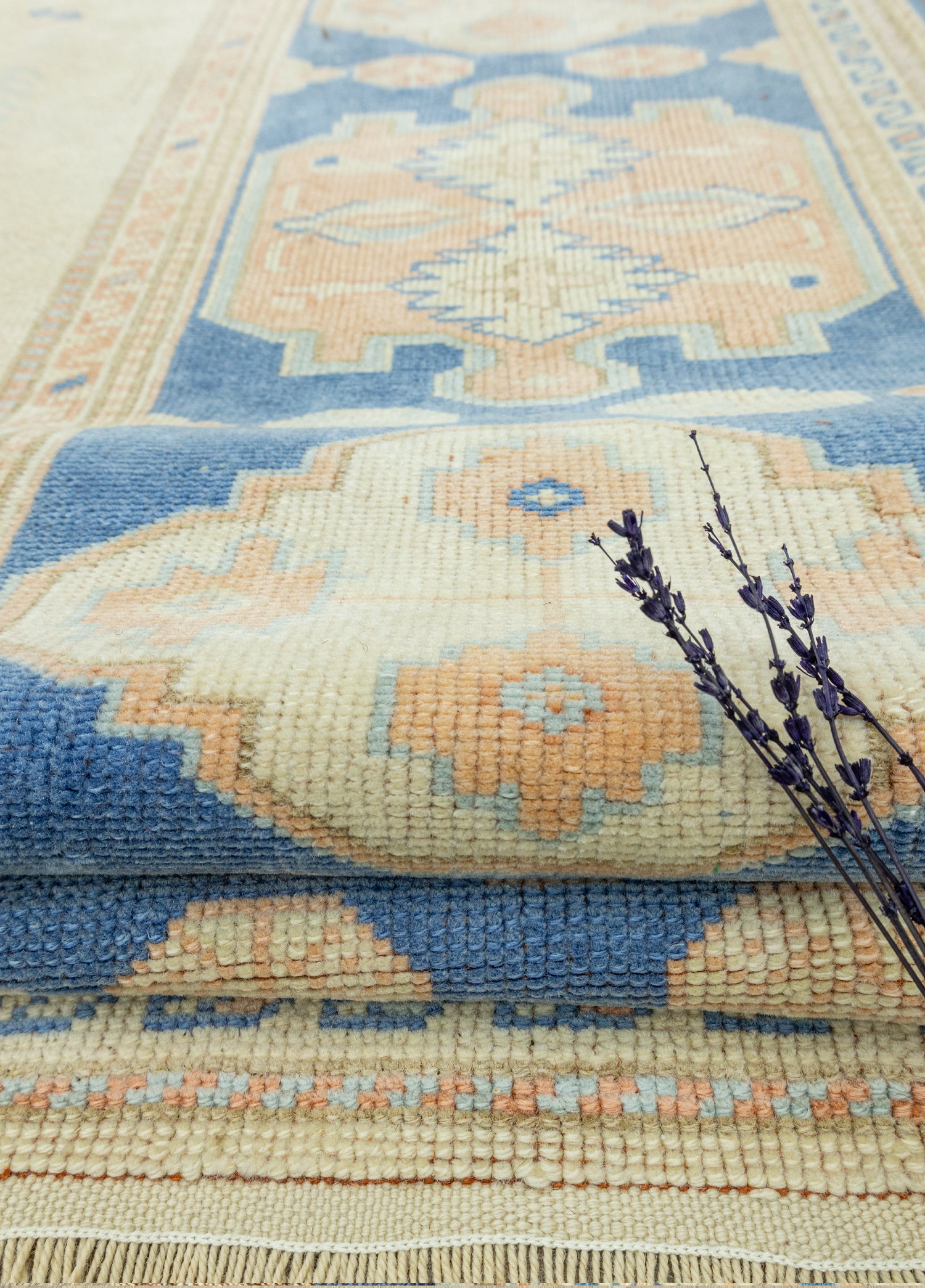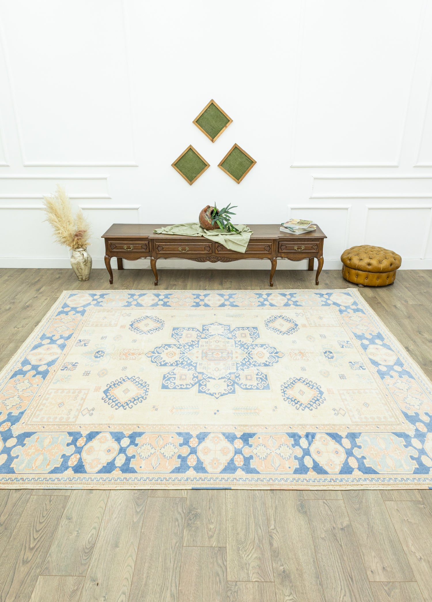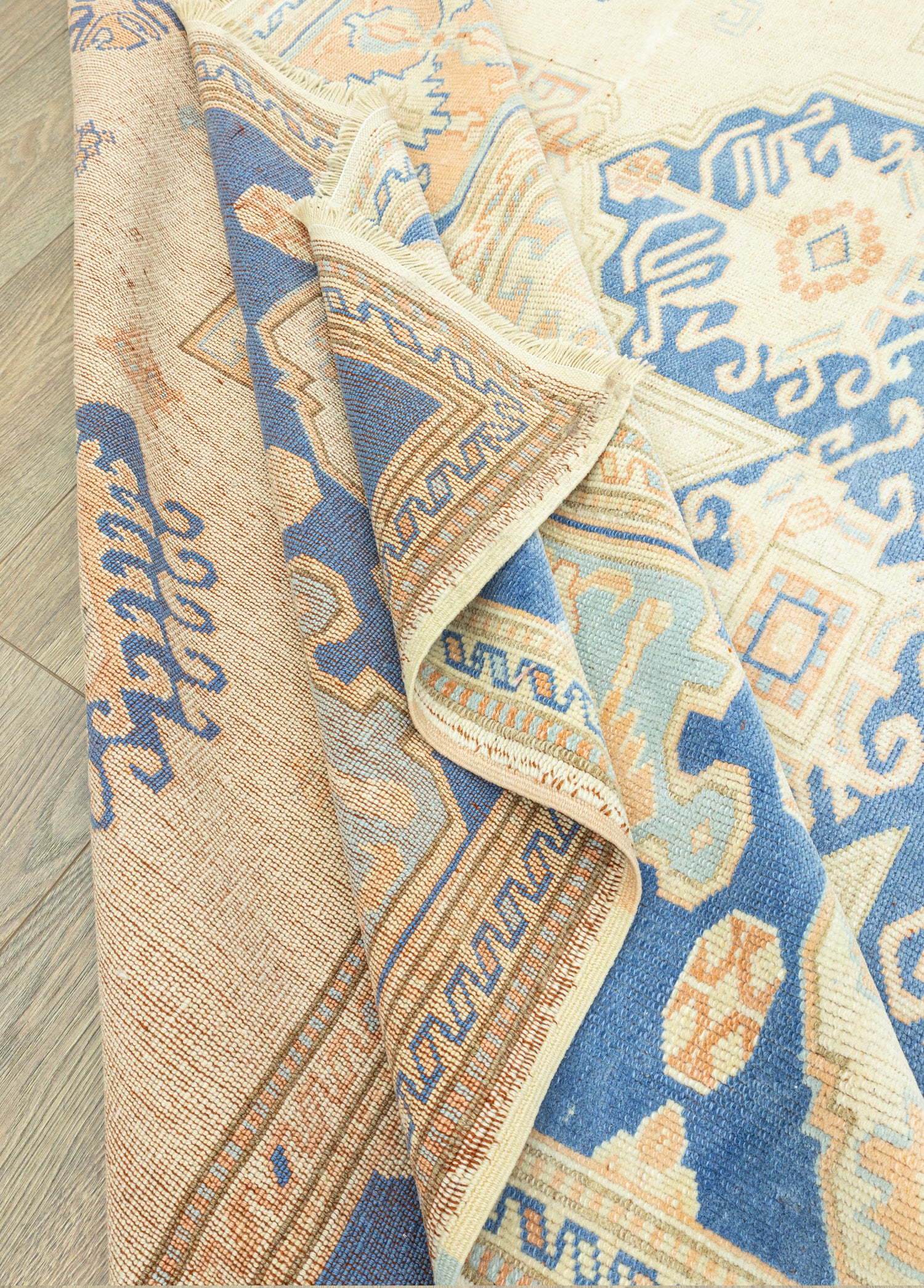 Soho Antiq el dokuma halı ve kilimleri, yaşam alanlarınıza nefes katmak için tasarlanmıştır. Bu zarif el dokuma halı, özenle seçilmiş yüksek kaliteli yün ipliklerinin ustalıkla bir araya getirilmesiyle oluşturulmuştur. Geleneksel el dokuma teknikleri kullanılarak üretilen halı, evinize sıcaklık ve zarafet katmak amacıyla özel olarak tasarlanmıştır. Renk paleti, doğanın yumuşak tonlarından ilham alınarak oluşturulmuş olup, krem ile mavi renklerinin uyumuyla dikkat çekerken halı içerisinde bulunan diğer renkler ile uyumu yakalamaktadır. Halı, deneyimli el sanatçıları tarafından özenle dokunmuş ve Ege yöresine özgü geleneksel tekniklerle 1970’lerde üretilmiştir, bu da halıya kültürel bir derinlik katmaktadır. Halının ebatı 265 x 297 cm olarak ölçülmüştür ve bu ölçü, halının farklı yaşam alanlarına kolaylıkla uyum sağlamasını sağlar. Halının kalınlığı ise 1 - 3 cm arasındadır. Estetik değerinin ötesinde, bu el dokuma halı, evinize özgünlük ve geleneksel bir his katma konusunda öne çıkmaktadır.