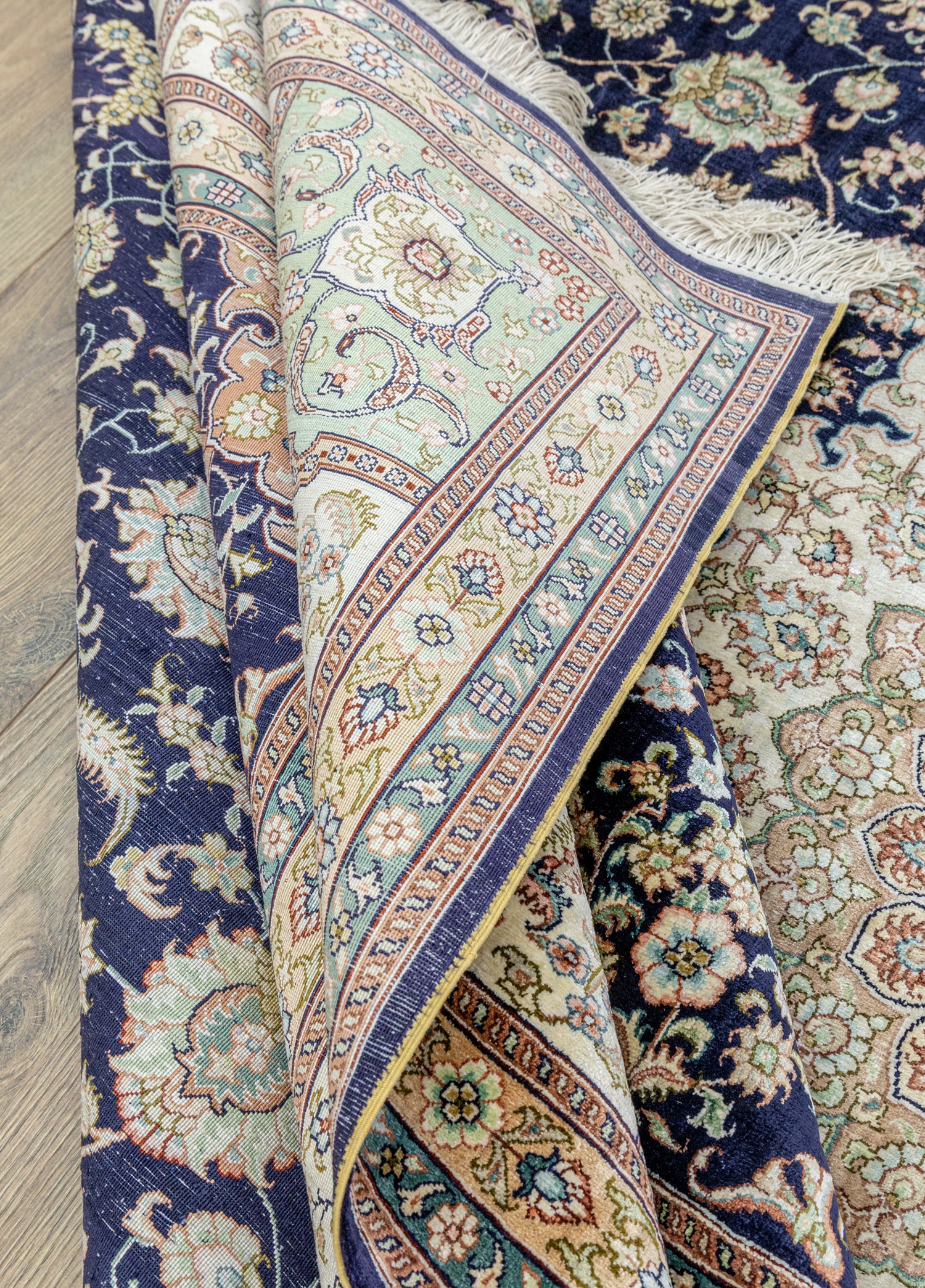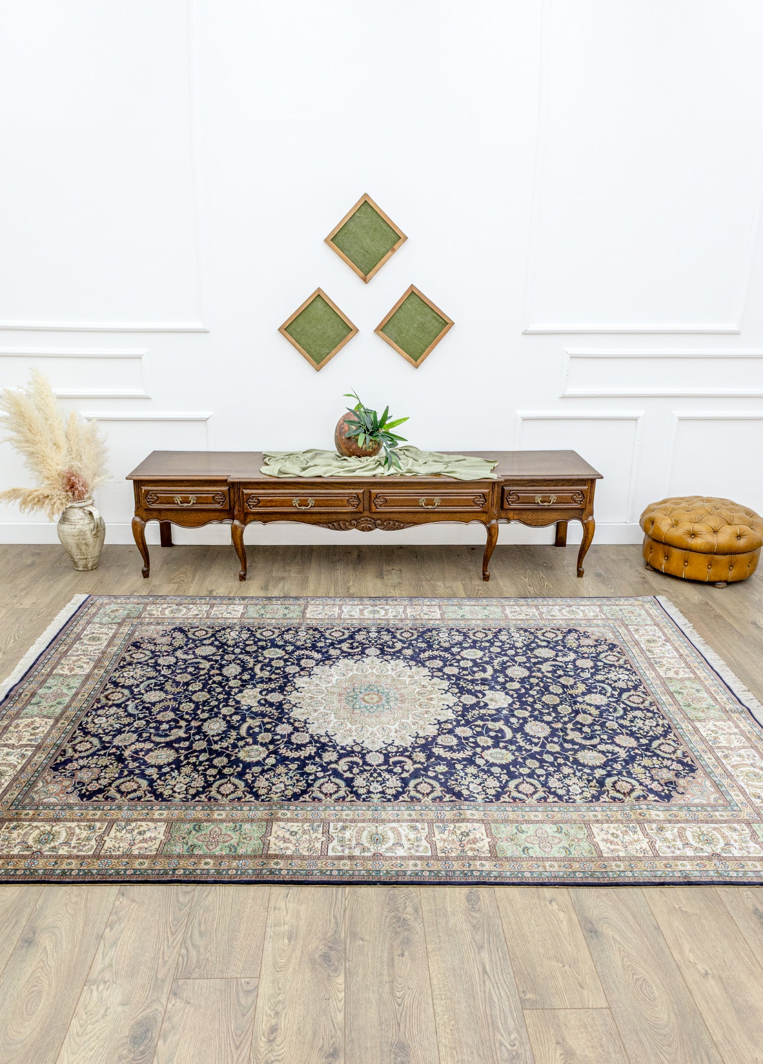 Geleneksel el dokuma teknikleri kullanılarak üretilen halı,evinize sıcaklık ve zarafet katmak amacıyla özel olarak tasarlanmıştır. Renkpaleti, doğanın yumuşak tonlarından ilham alınarak oluşturulmuş olup, lacivert, krem ve yeşil renklerinin uyumuyla dikkat çekerken halı içerisinde bulunan diğer renkler ilede dengeli bir bütünlük sunar.