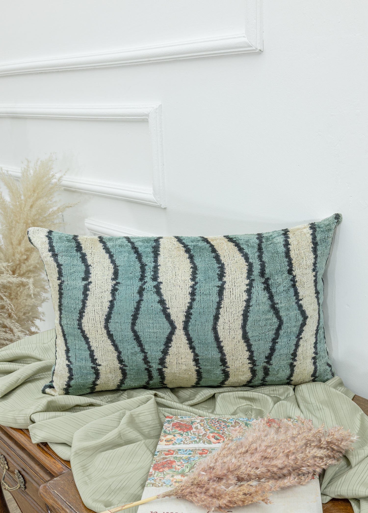 İkat kadife yastıklar, ikat desenleme tekniğiyle üretilen ve kadife kumaş kullanılarak yapılan yastıklardır. Bu yastıklar, hem ikat deseninin görsel çekiciliğini taşırken hem de kadife kumaşın yumuşaklık ve lüks hissini sunar.