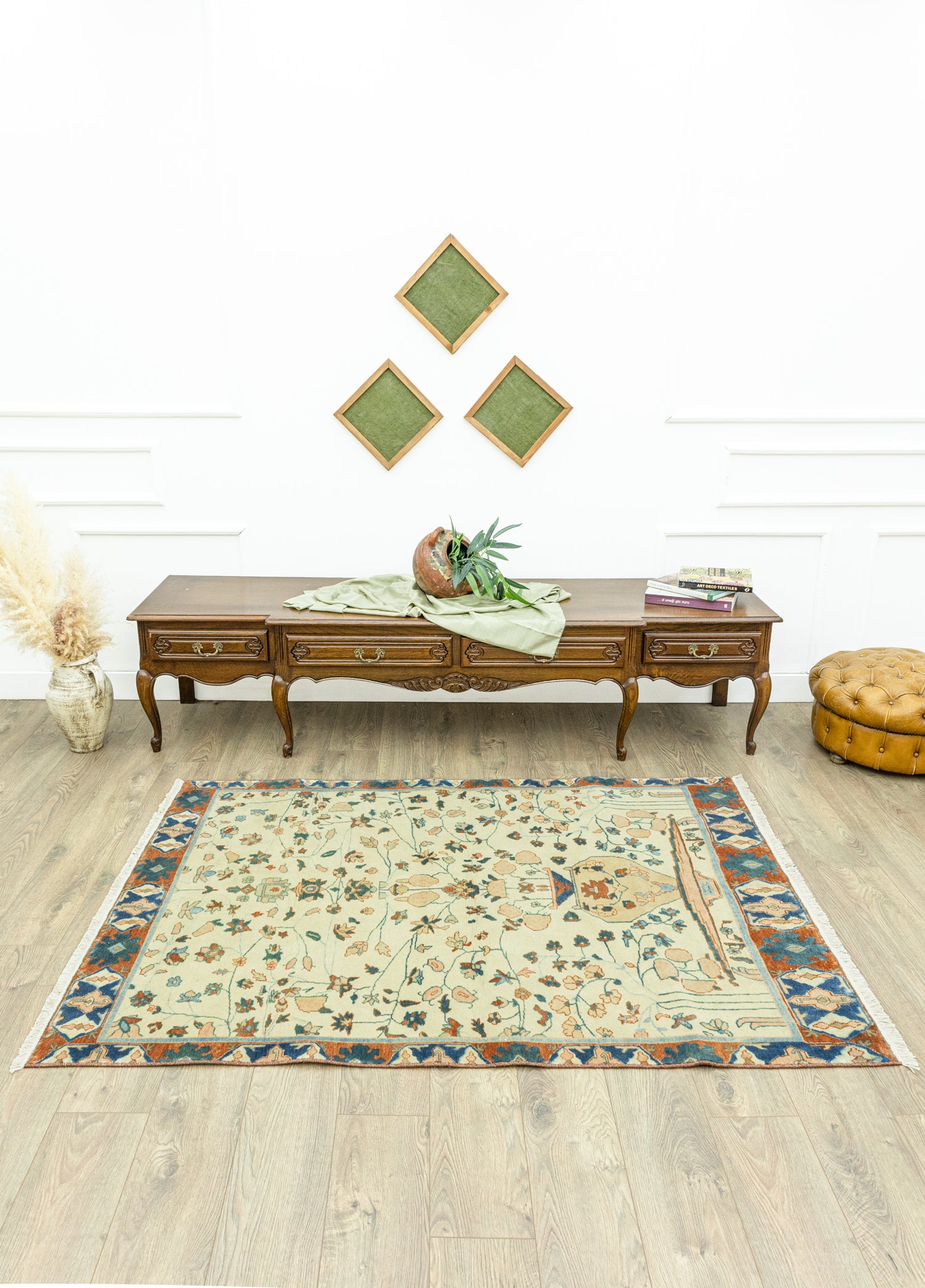 Soho Antiq el dokuma halı ve kilimleri, yaşam alanlarınızanefes katmak için tasarlanmıştır. Bu zarif el dokuma halı, özenle seçilmişyüksek kaliteli yün ipliklerinin ustalıkla bir araya getirilmesiyleoluşturulmuştur. Geleneksel el dokuma teknikleri kullanılarak üretilen halı,evinize sıcaklık ve zarafet katmak amacıyla özel olarak tasarlanmıştır. Renkpaleti, doğanın yumuşak tonlarından ilham alınarak oluşturulmuş olup, krem, kırmızı ve mavi renklerinin uyumuyla dikkat çekerken halı içerisinde bulunan diğer renkler ileuyumu yakalamaktadır. Halı, deneyimli el sanatçıları tarafından özenle dokunmuşve Azerbaycan yöresine özgü geleneksel tekniklerle 1990'larda üretilmiştir, bu da halıyakültürel bir derinlik katmaktadır. Halının ebatı 132 x 190 cm olarak ölçülmüştürve bu ölçü, halının farklı yaşam alanlarına kolaylıkla uyum sağlamasını sağlar.Halının kalınlığı ise 1 - 3 cm arasındadır. Estetik değerinin ötesinde, bu eldokuma halı, evinize özgünlük ve geleneksel bir his katma konusunda öneçıkmaktadır.