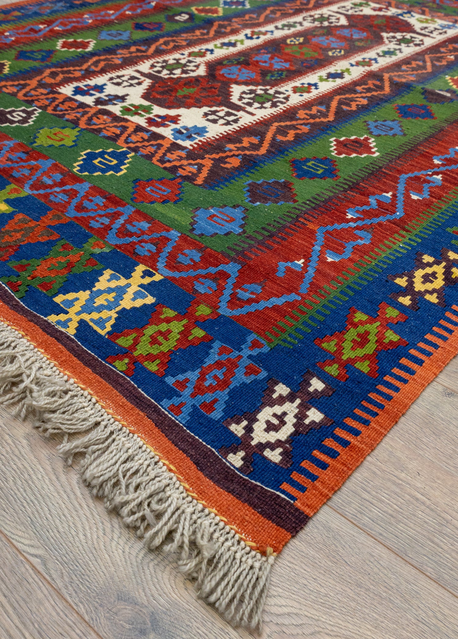 El dokuma kilimin ebatı 141 x 184 cm'dir ve kalınlığı da 1-3cm arasındadır. Yöresel dokunuşlara sahip olan kilimlerimiz, Anadolu'nun özgüntasarımlarından esinlenerek üretilmiştir. Bu tasarımlar özellikle 1970'lerintarzına sahip olup, evinize nostaljik bir hava katacaktır.