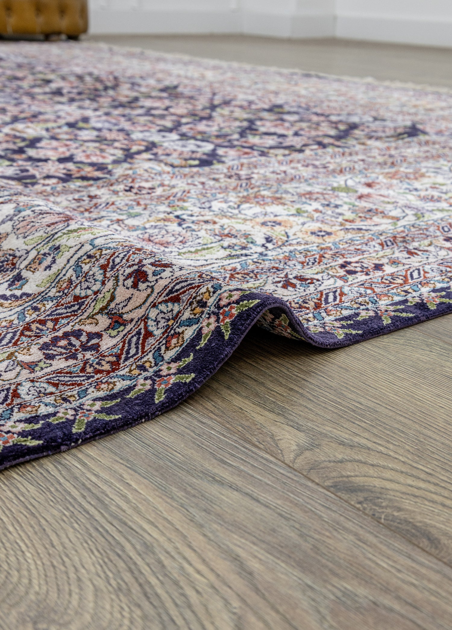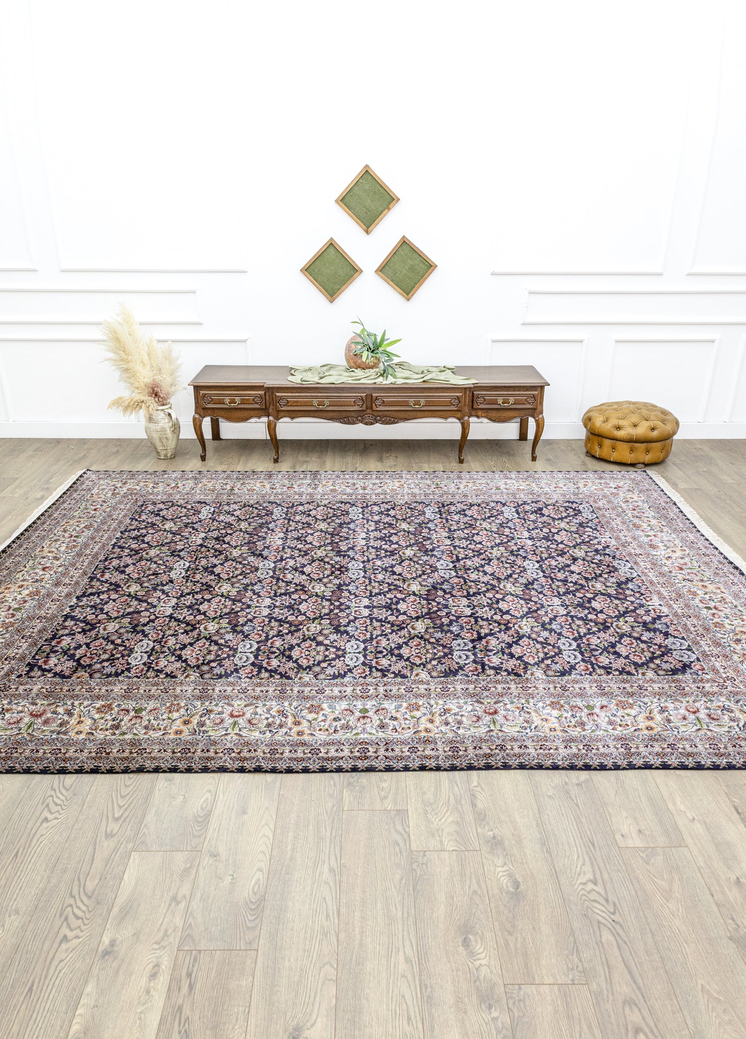 Geleneksel el dokuma teknikleri kullanılarak üretilen halı,evinize sıcaklık ve zarafet katmak amacıyla özel olarak tasarlanmıştır. Renkpaleti, doğanın yumuşak tonlarından ilham alınarak oluşturulmuş olup, lacivert ile pastel pembe renklerinin uyumuyla dikkat çekerken halı içerisinde bulunan diğer renkler ilede dengeli bir bütünlük sunar.