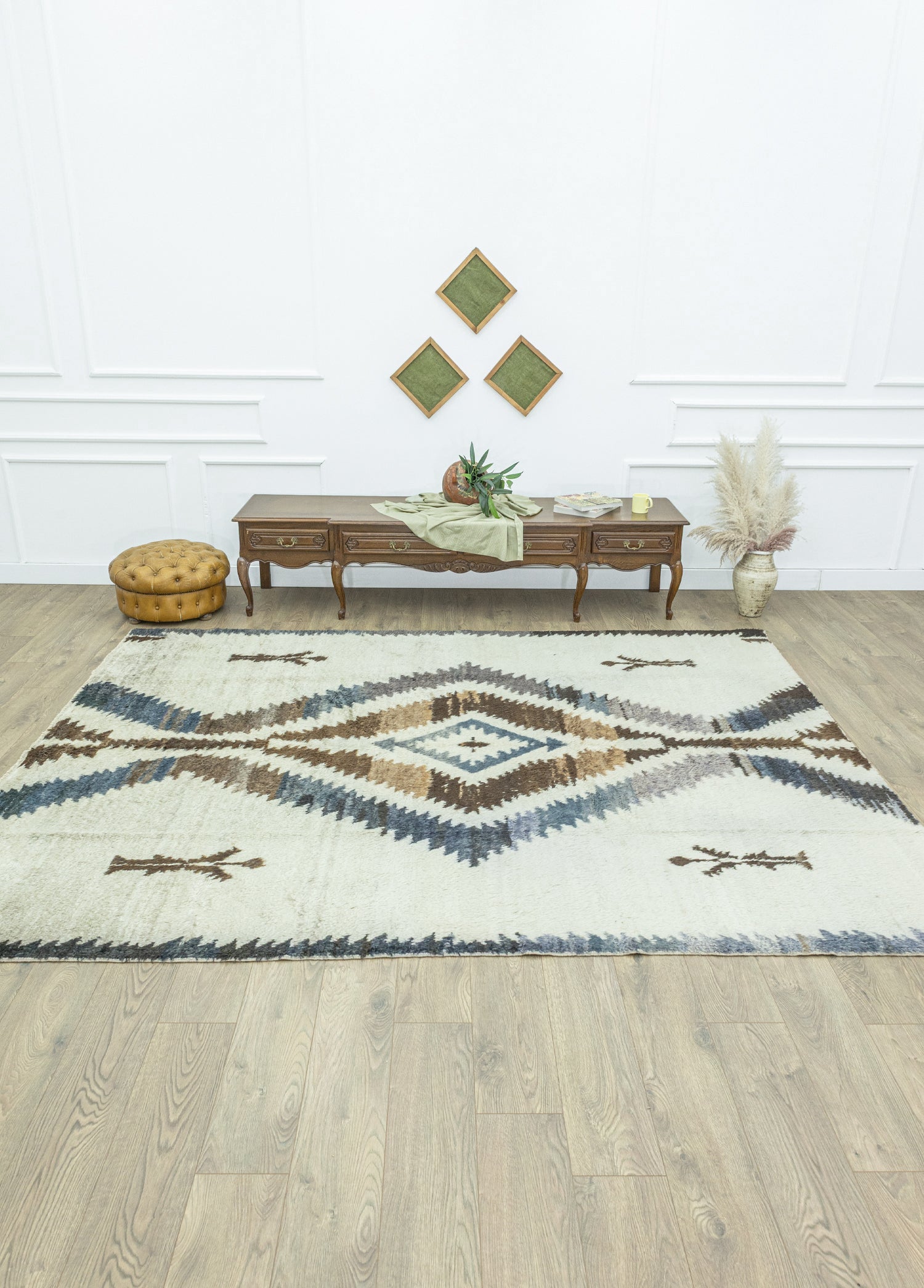 Gösterişli ve estetik tasarımlarıyla Soho Antiq halı modellerimiz, yaşam alanınıza yeni bir hava katacak! Uzun ömürlü halı modelimiz tamamen yünden oluşur ve özel el dokuma tekniği ile dokunmaktadır. Halı modelini özel yapan ve yıllar geçse de kaliteyi korumasını sağlayan becerilerle ürettiğimiz bu halı 1 ile 3 cm arası bir kalınlığa sahiptir ve boyu 242 x 314 cm’dir. Pek çok renk seçeneğine sahip halı modelleri içerisinden seçtiğiniz halının ana rengi kremdir. Ayrıca halı tasarımında bulunan diğer renkler mavi ve kahverengidir. Soho Antiq içerisinde, kültürel ve geleneksel özelliklere sahip halılar bulunur. Geçmişten günümüze gelen bu halı modeli Anadolu tarihinden izler taşır ve özellikle Uşak yöresinden kültürel renk ve dokunuşlara sahiptir. Tüm bu geleneksel dokunuşları, halı üzerindeki yöresel uşak halısı deseninde görmek mümkün.