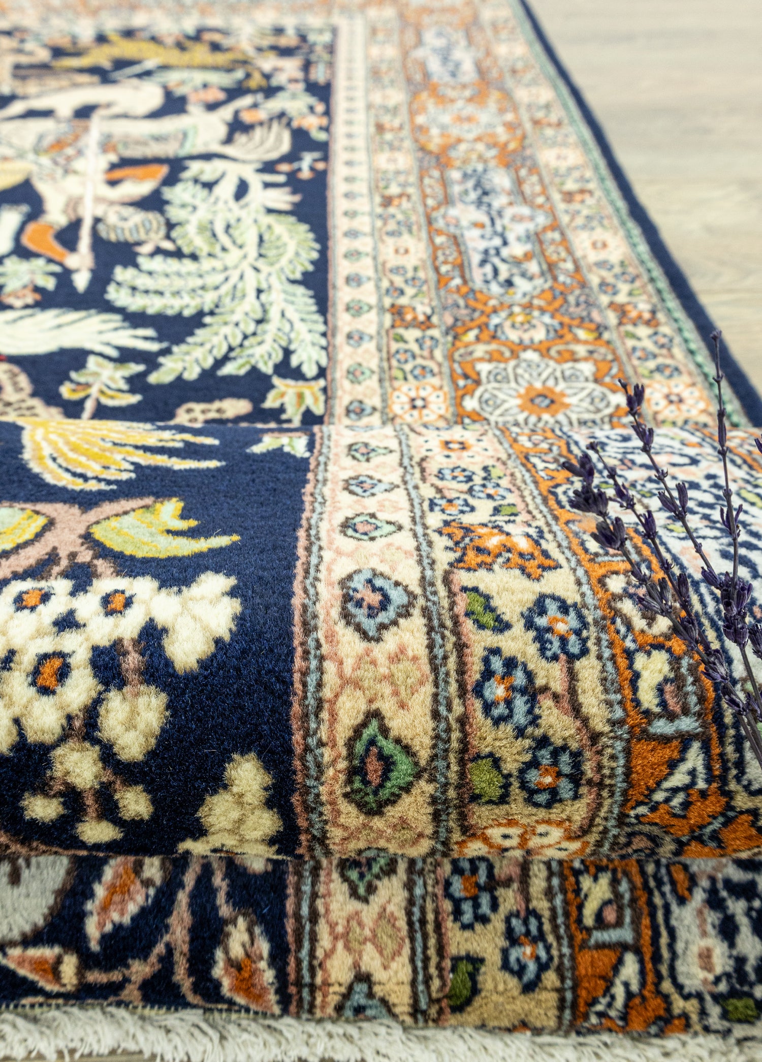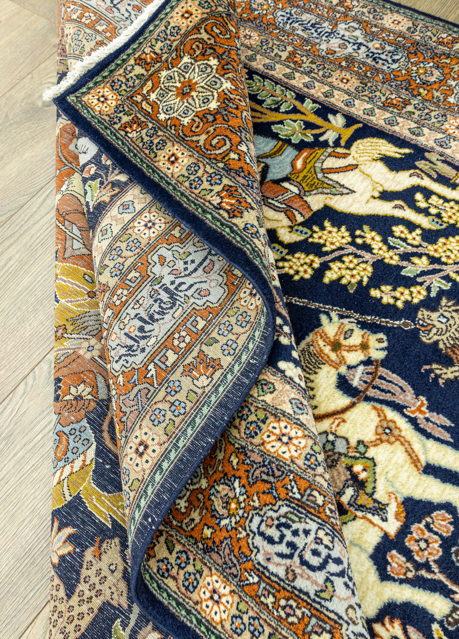 Soho Antiq koleksiyonumuzda, kültürel ve geleneksel özelliklere sahip halılar bulunmaktadır. Bu halılar, tarih boyunca İran, Tebriz yöresine ait kültürel renk ve dokunuşları yansıtarak özellikle 1950'ler döneminden gelen mirası taşımaktadır. Geleneksel dokunuşların en güzel örneklerini, halı üzerindeki Av Sahnesi desen tasarımında görebilirsiniz.