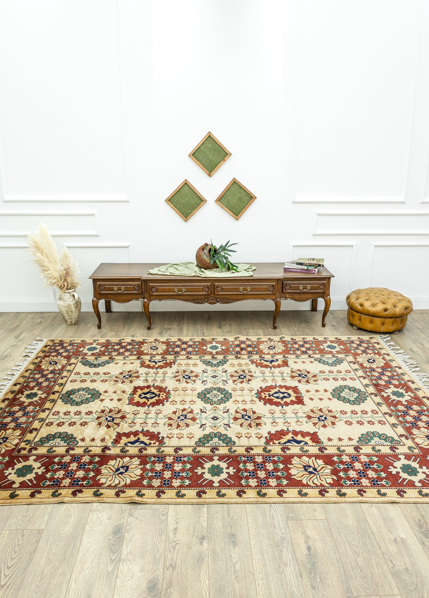 Soho Antiq el dokuma halı ve kilimleri, yaşam alanlarınızanefes katmak için tasarlanmıştır. Bu zarif el dokuma halı, özenle seçilmişyüksek kaliteli yün ve pamuk ipliklerinin ustalıkla bir araya getirilmesiyleoluşturulmuştur. Geleneksel el dokuma teknikleri kullanılarak üretilen halı,evinize sıcaklık ve zarafet katmak amacıyla özel olarak tasarlanmıştır. Renkpaleti, doğanın yumuşak tonlarından ilham alınarak oluşturulmuş olup, bej ile kırmızı renklerinin uyumuyla dikkat çekerken halı içerisinde bulunan diğer renkler ileuyumu yakalamaktadır. Halı, deneyimli el sanatçıları tarafından özenle dokunmuşve Uşak yöresine özgü geleneksel tekniklerle 1990'larda üretilmiştir, bu da halıyakültürel bir derinlik katmaktadır. Halının ebatı 211 x 305 cm olarak ölçülmüştürve bu ölçü, halının farklı yaşam alanlarına kolaylıkla uyum sağlamasını sağlar.Halının kalınlığı ise 1 - 3 cm arasındadır. Estetik değerinin ötesinde, bu eldokuma halı, evinize özgünlük ve geleneksel bir his katma konusunda öneçıkmaktadır.